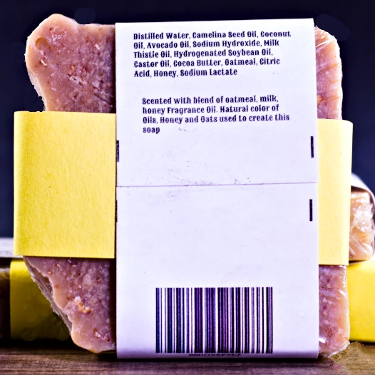 Ingredients: Distilled water, Milk Thistle Seed Oil, Coconut Oil, Flax Seed Oil, Avocado Oil, Sodium Hydroxide (Lye), Hydrogenated Soybean, Castor oil, Cocoa Butter, Hempseed Oil, Oatmeal, Citric Acid, Honey, Sodium Lactate